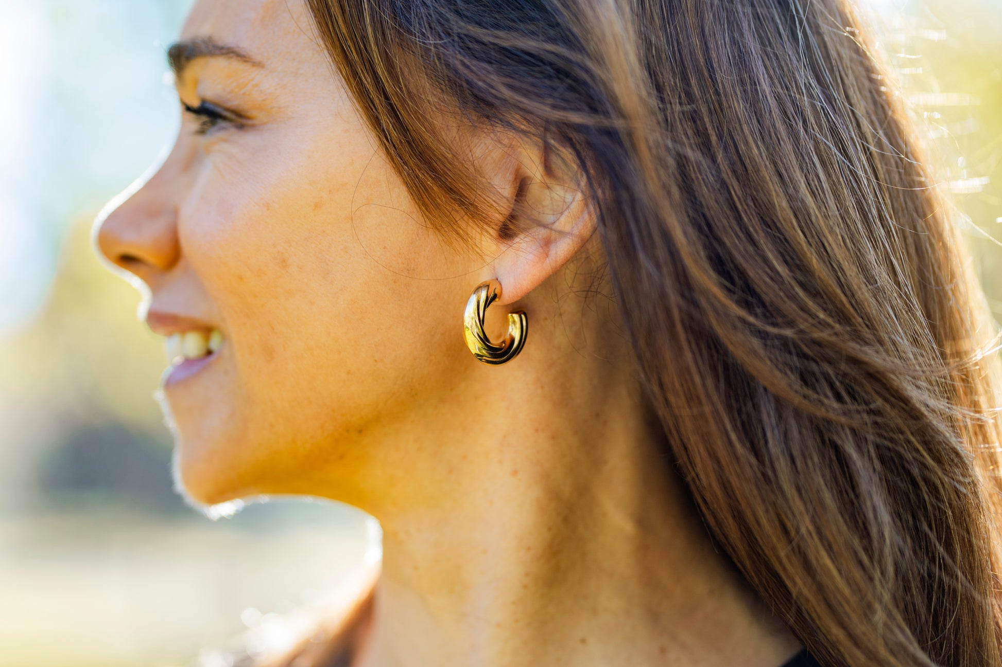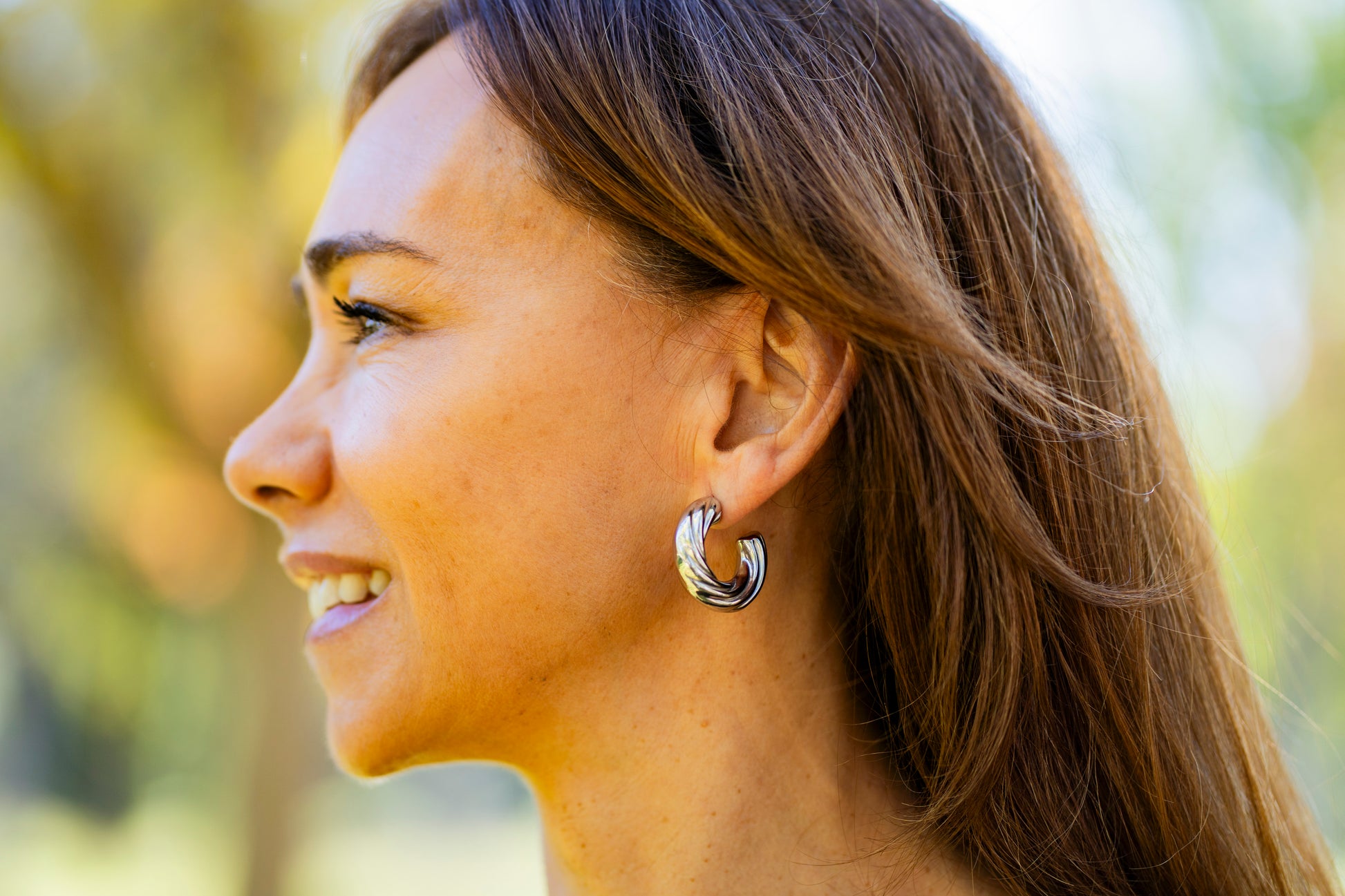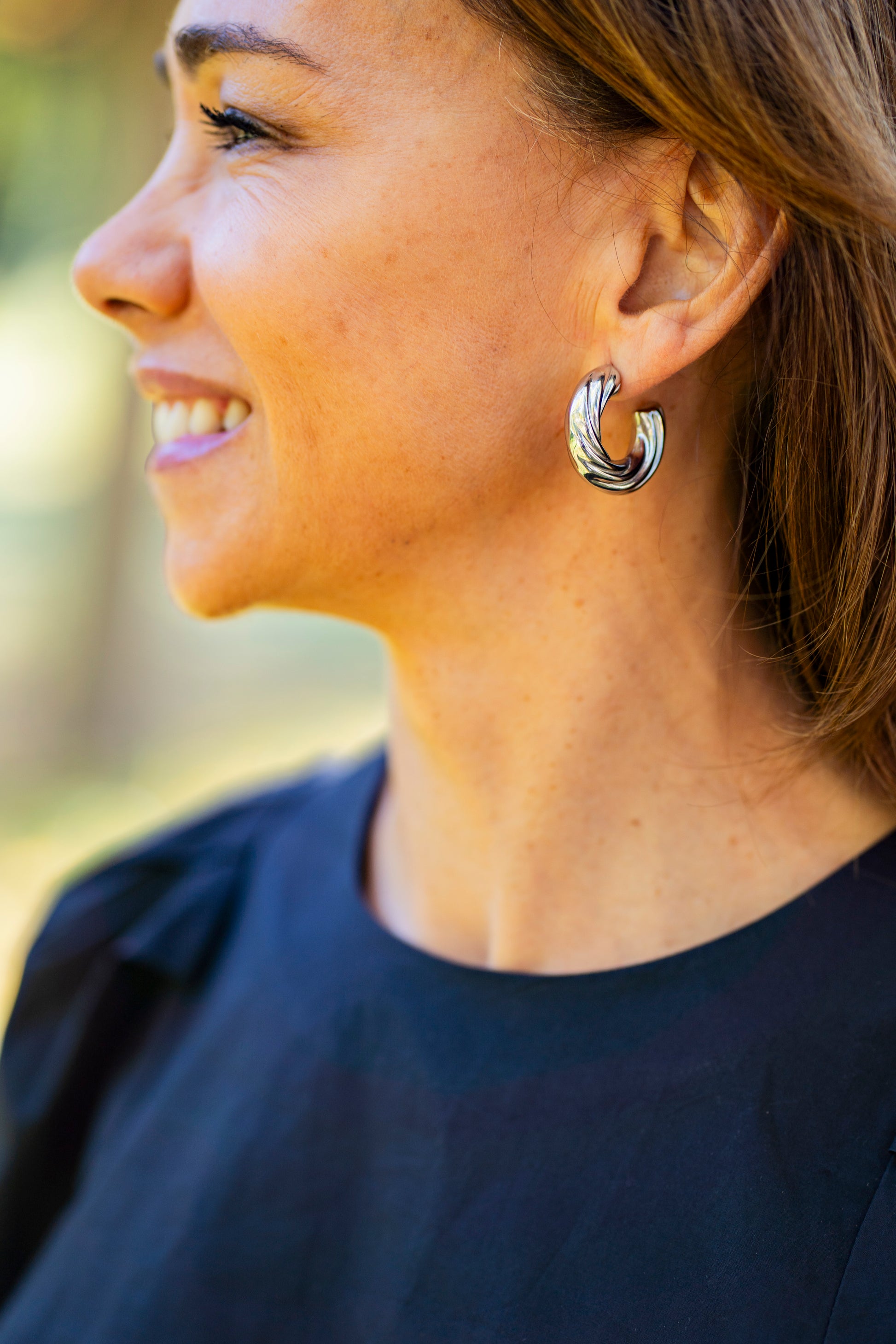Pendientes de aro y forma espectacular y muy favorecedora. De acero chapado. Hipoalergénicos. Especial para tus looks más especiales. Ideal si no eres de pendientes que cuelguen pero te gustan los pendientes vistosos. Se convertirá en un básico de tu joyero. Invitadas perfectas. Lúcelo en tus eventos mas queridos o para los momentos mas casual e informales. Brillan contigo y no pasarás desapercibida. Sin Níquel y Sin Plomo Cierre de presión. Dos medidas: 25 y 30 mm. Muy ligeros. La tendencia mas vista de toda la temporada para elevar cualquier look.