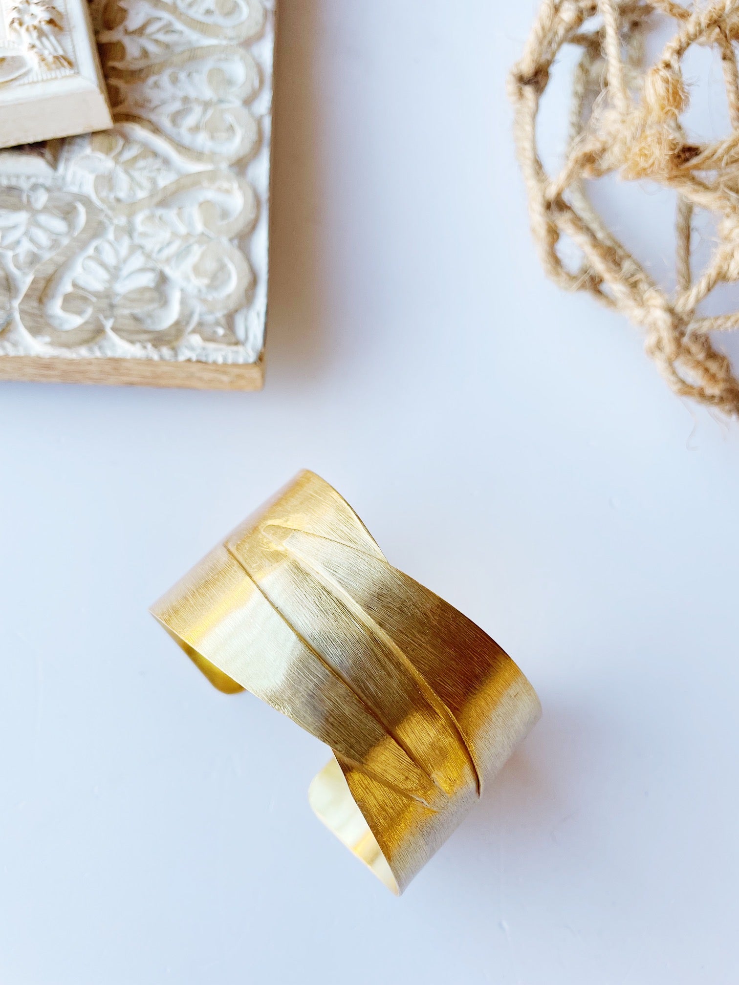 Brazalete hecho a mano en la mejor calidad de latón macizo chapado en oro de 18kt. 1.5 micras. y acabado mate. Ligero y ajustable por su excepcional calidad. Es el complemento perfecto para tu outfit. Ancho 4cm. Hipoalergénico. Complemento de invitada, muy favorecedor.