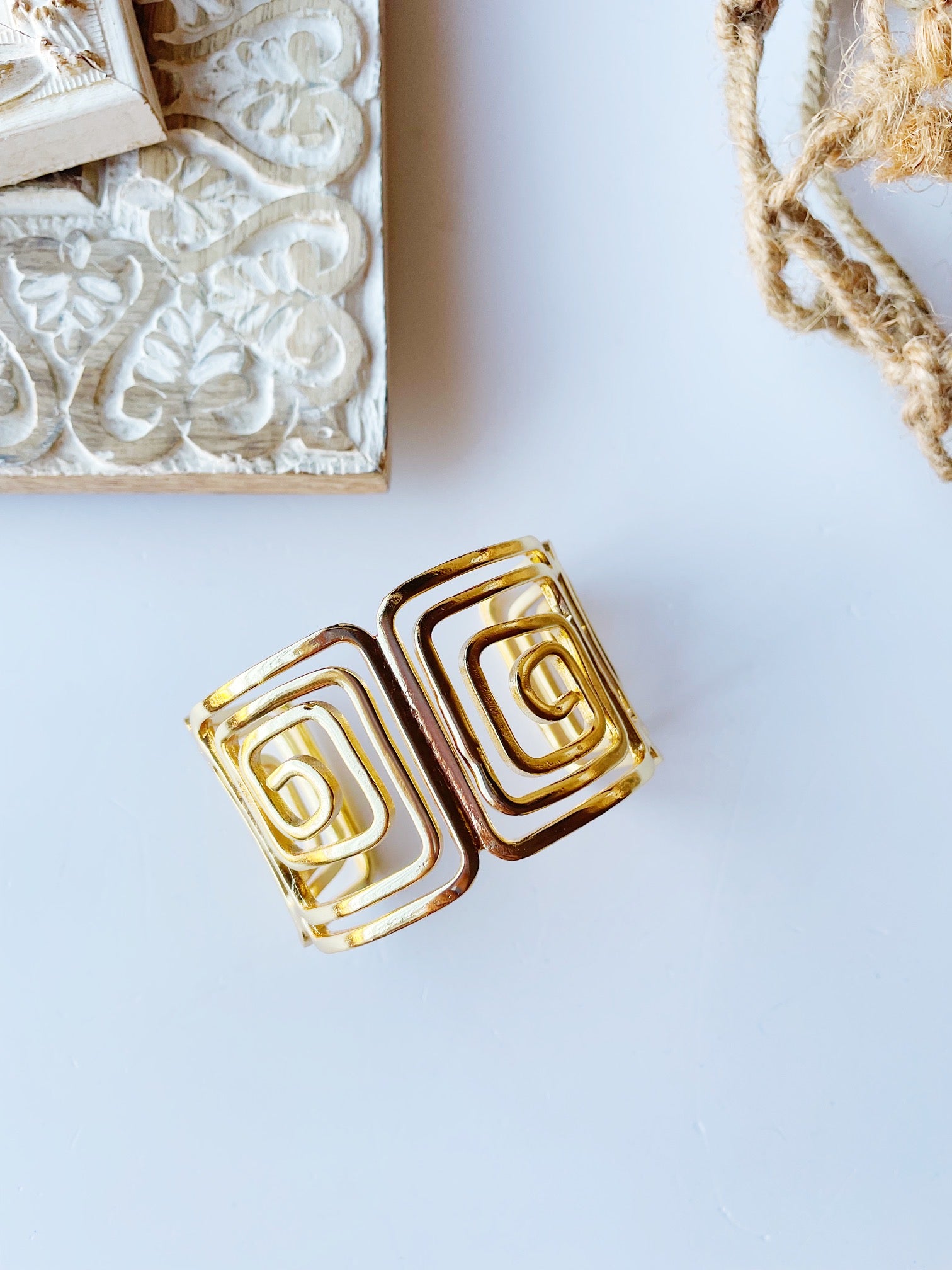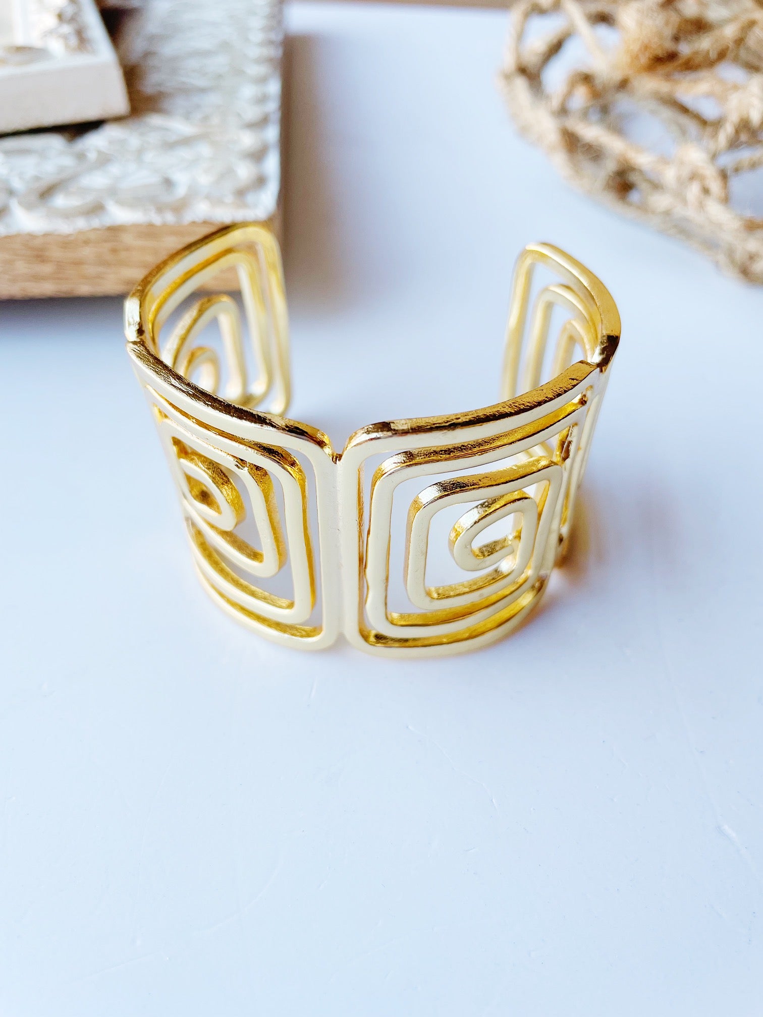 Brazalete hecho a mano en tiras de latón liso, chapado en oro de 18kt. 1.5 micras. y acabado en brillo. Ligero y ajustable por su excepcional calidad. Es el complemento perfecto para tu outfit. Ancho 4cm. Hipoalergénico. Complemento de invitada, muy favorecedor.