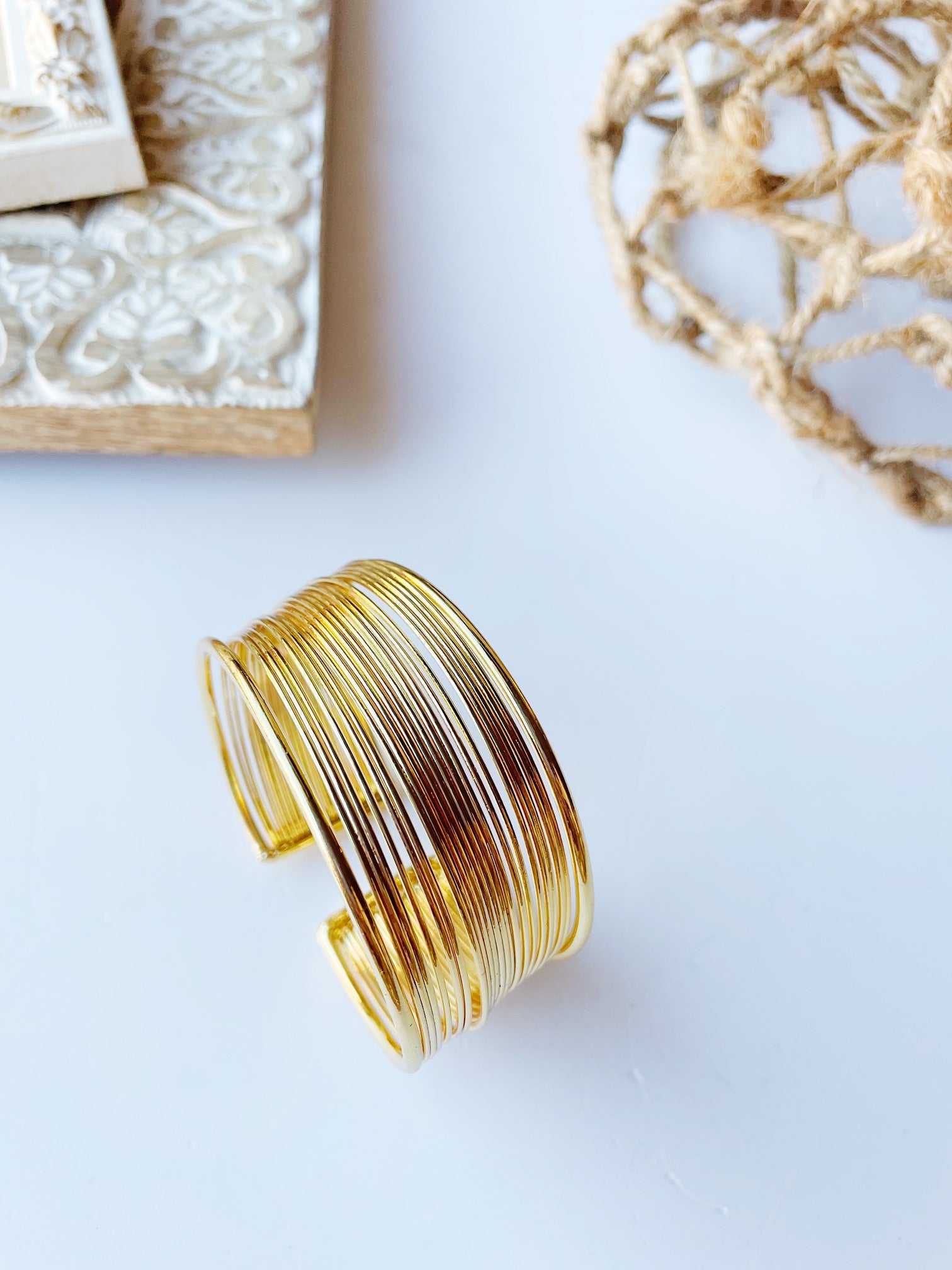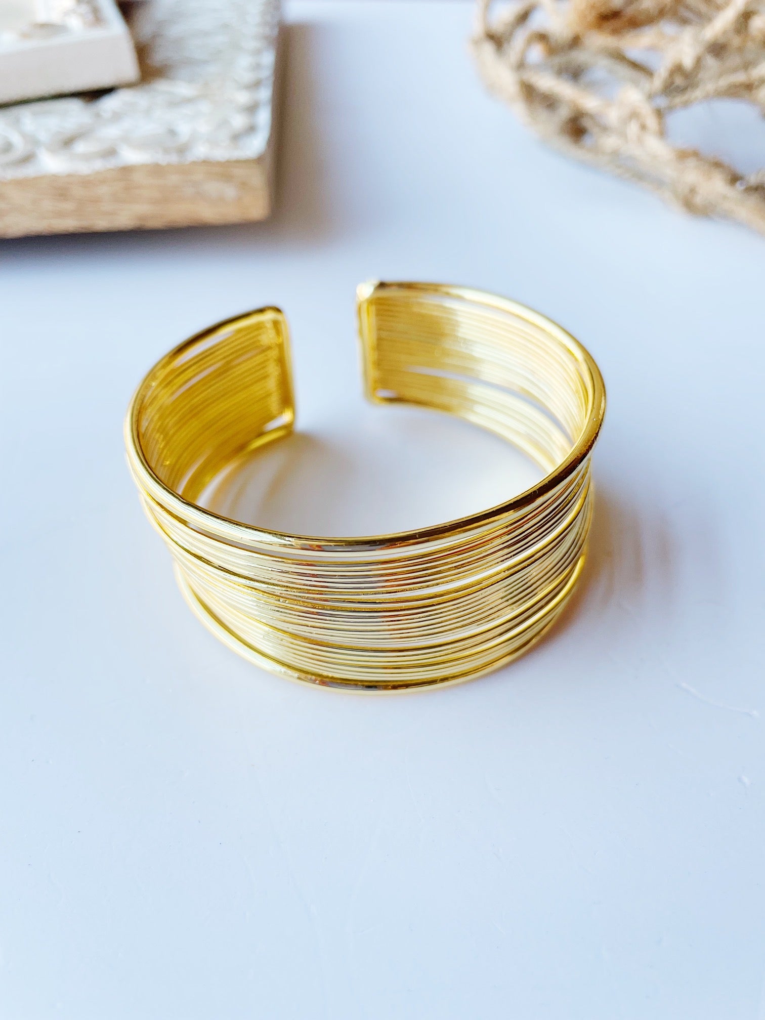 Brazalete hecho a mano en finas tiras de latón trabajado ,chapado en oro de 18kt. 1.5 micras. y acabado brillo. Ligero y ajustable por su excepcional calidad. Es el complemento perfecto para tu outfit. Ancho 3cm. Hipoalergénico. Complemento de invitada, muy favorecedor.