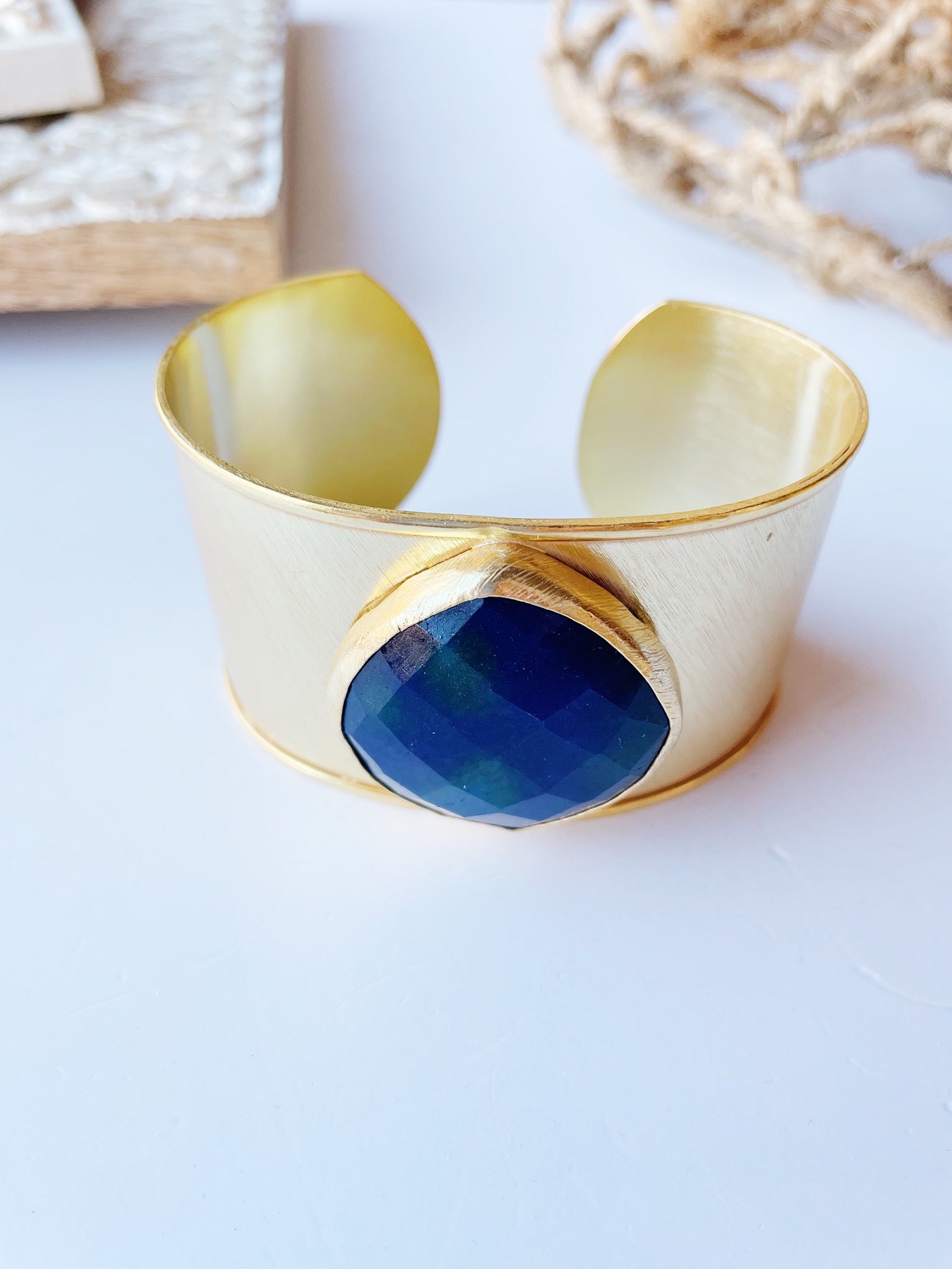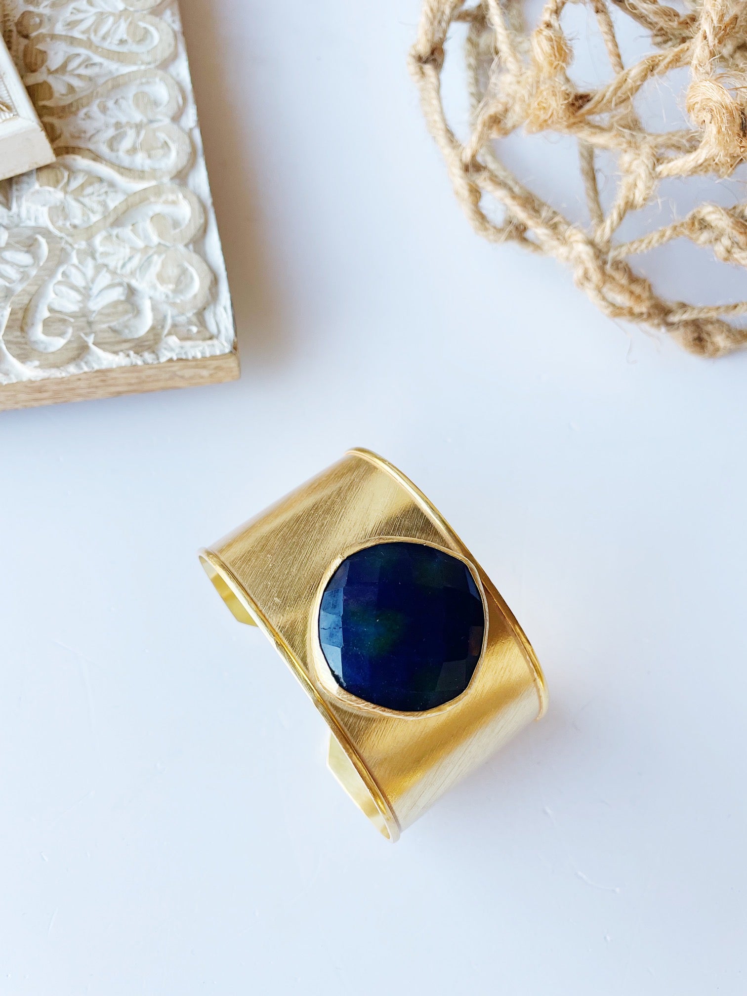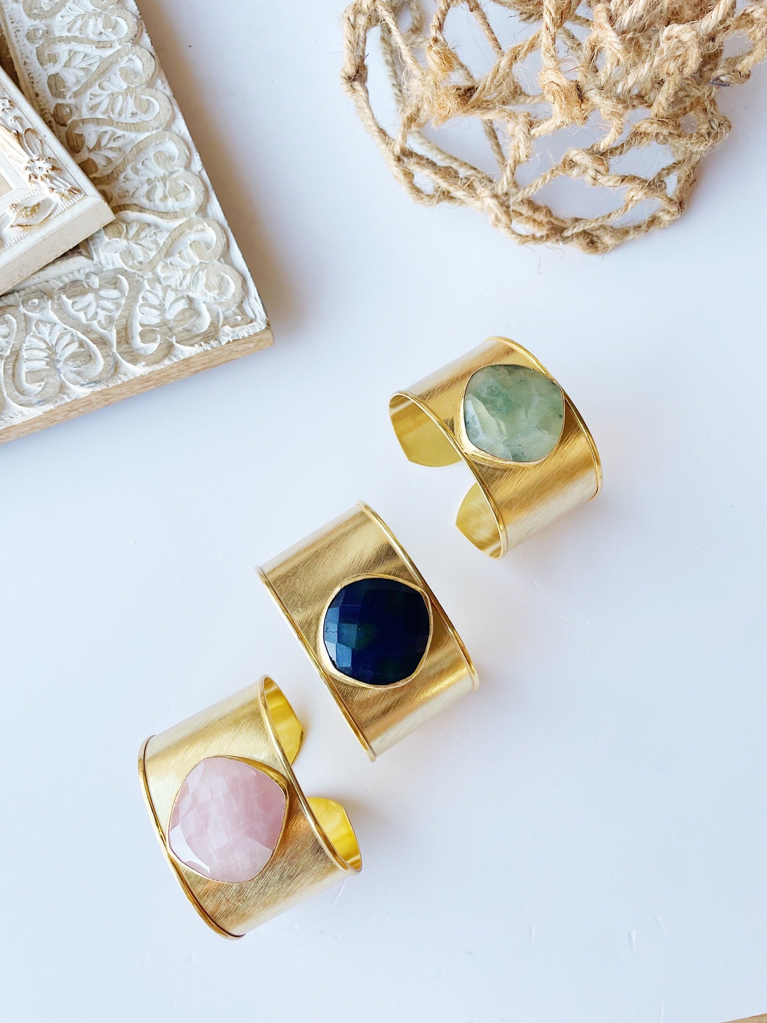 Brazalete hecho a mano en finas tiras de latón trabajado y piedras naturales (Lapislázuli, Peridoto o Cuarzo Rosa) chapado en oro de 18kt. 1.5 micras. y acabado mate. Ligero y ajustable por su excepcional calidad. Es el complemento perfecto para tu outfit. Ancho 3cm. Hipoalergénico. Complemento de invitada, muy favorecedor.
