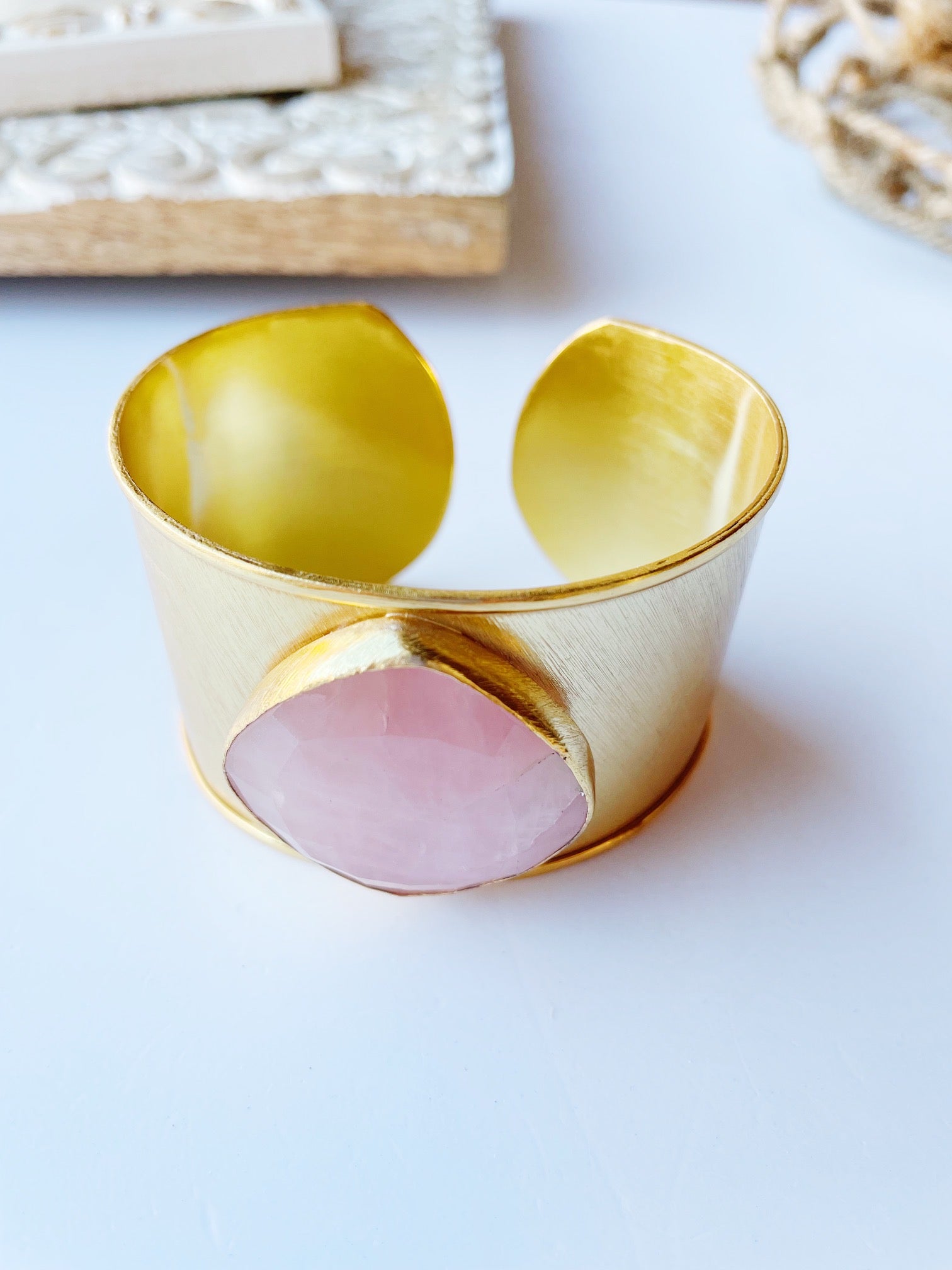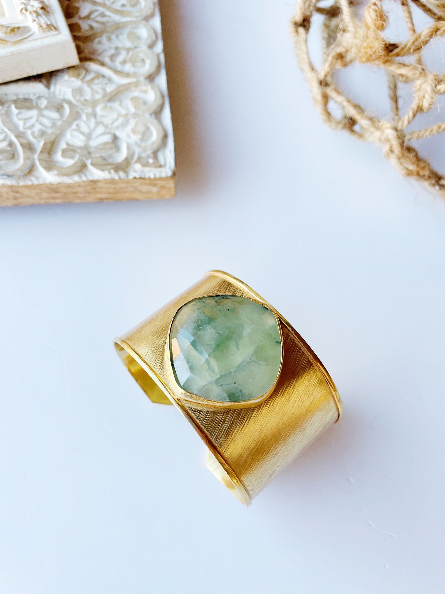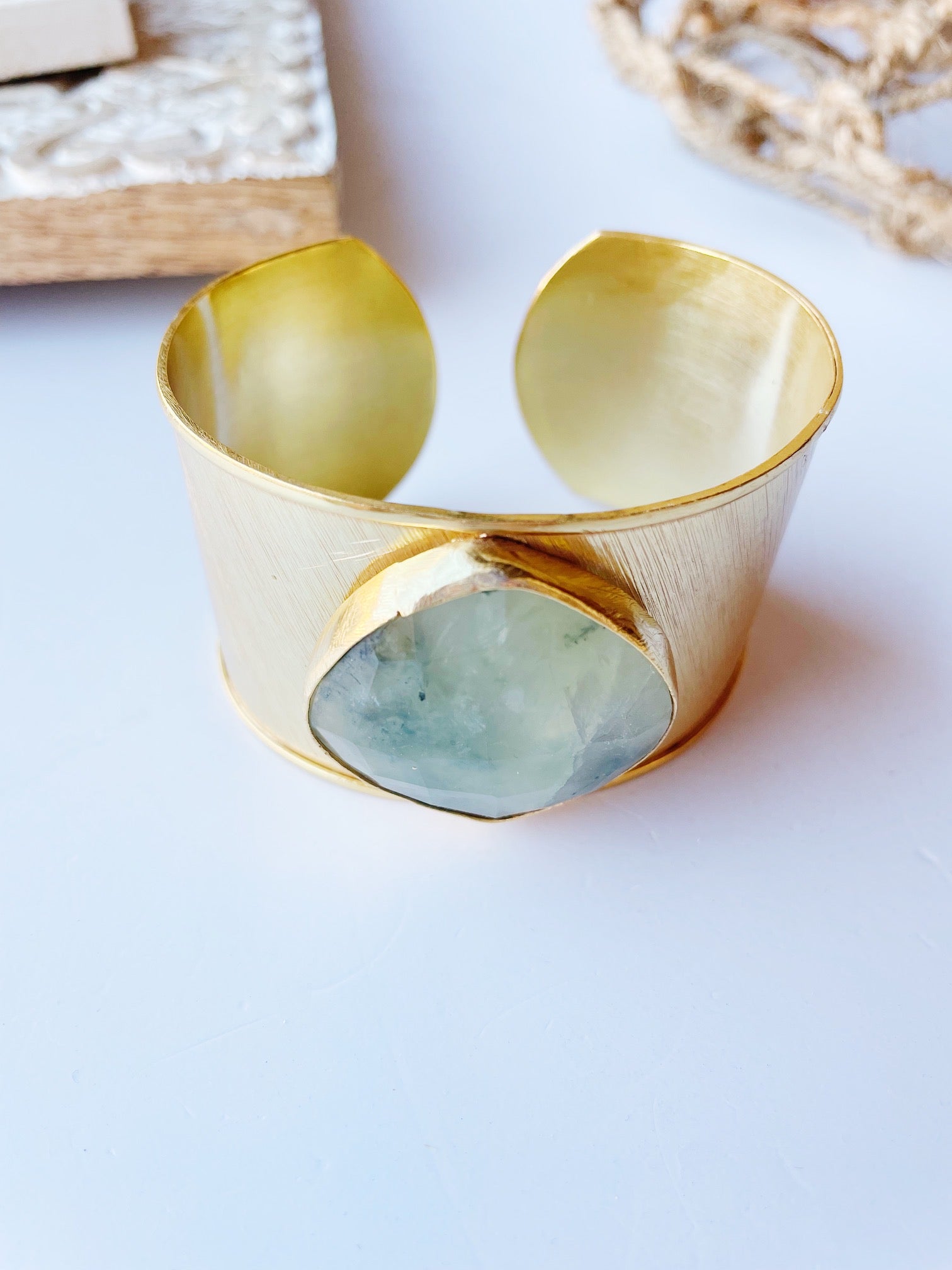 Brazalete hecho a mano en finas tiras de latón trabajado y piedras naturales (Lapislázuli, Peridoto o Cuarzo Rosa) chapado en oro de 18kt. 1.5 micras. y acabado mate. Ligero y ajustable por su excepcional calidad. Es el complemento perfecto para tu outfit. Ancho 3cm. Hipoalergénico. Complemento de invitada, muy favorecedor.