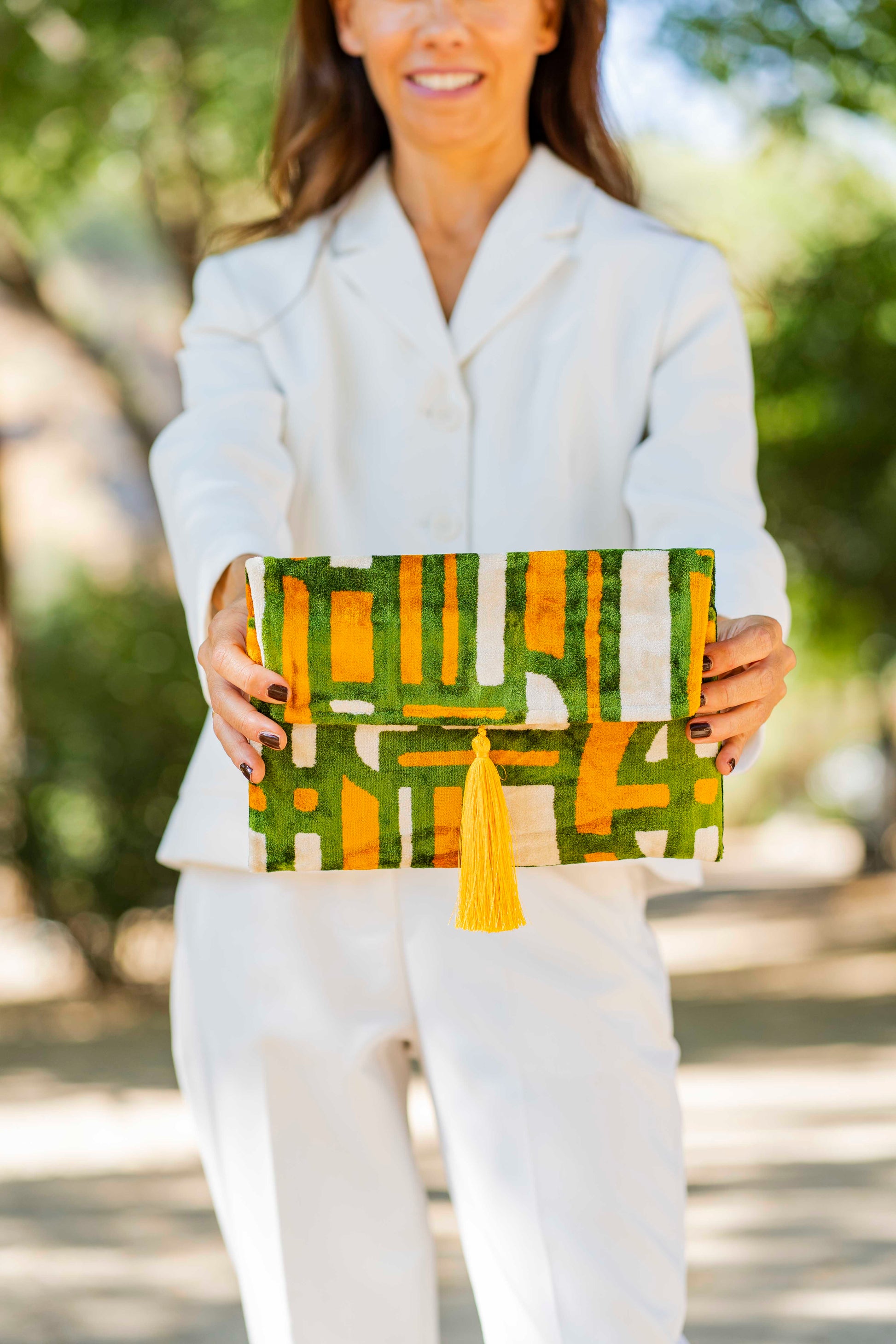 Cartera de mano ideal de Ikat, técnica de teñido el tejido con patrones, similar al tie-dye, confeccionada en terciopelo de seda. Colorido único y muy especial. te acompaña en tu look de perfecta invitada. Dimensiones 27 x18 cm. Borla de flecos de hilo de seda a juego o en contraste.Dispone de anclajes internos para cadena ( cadena no incluida)