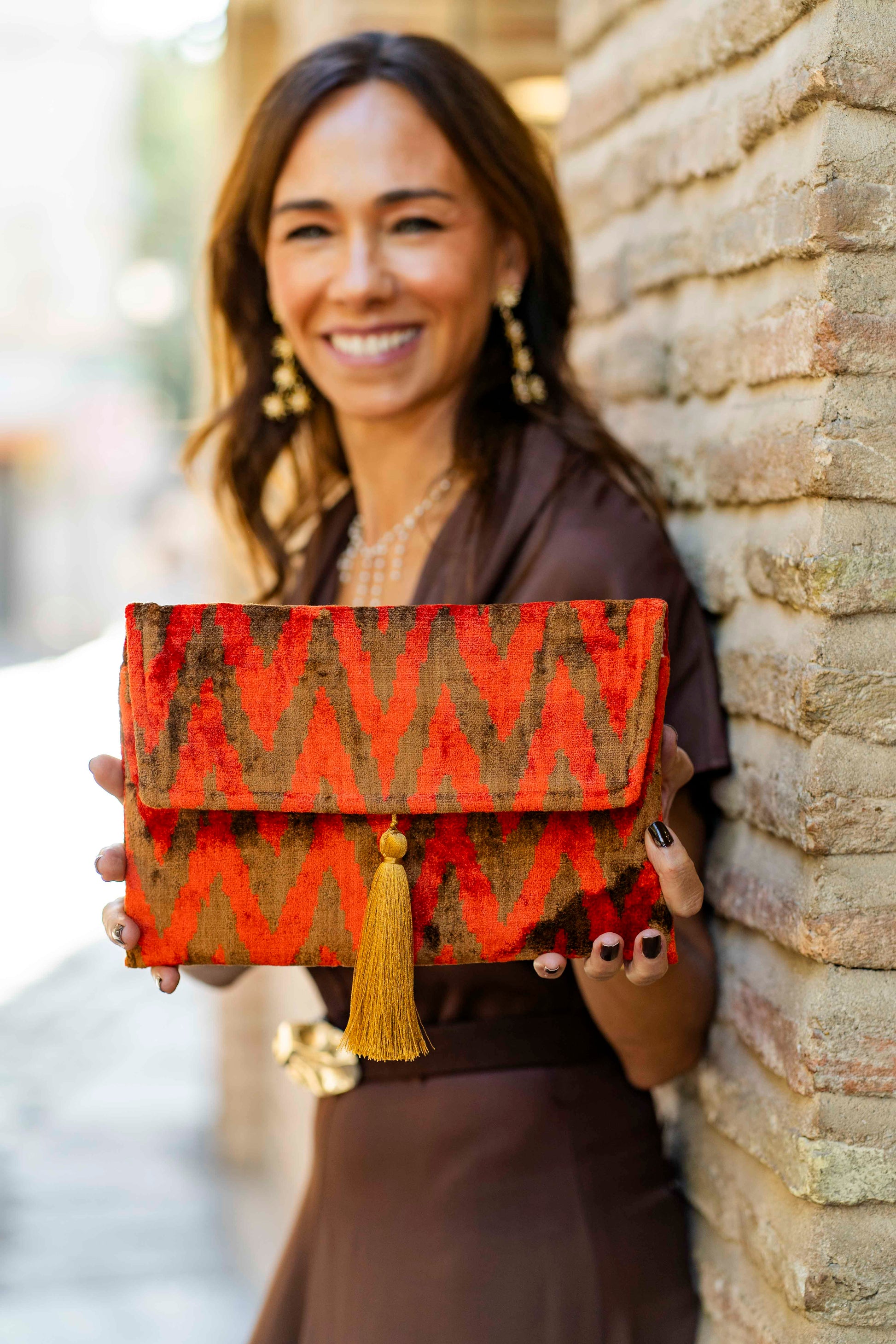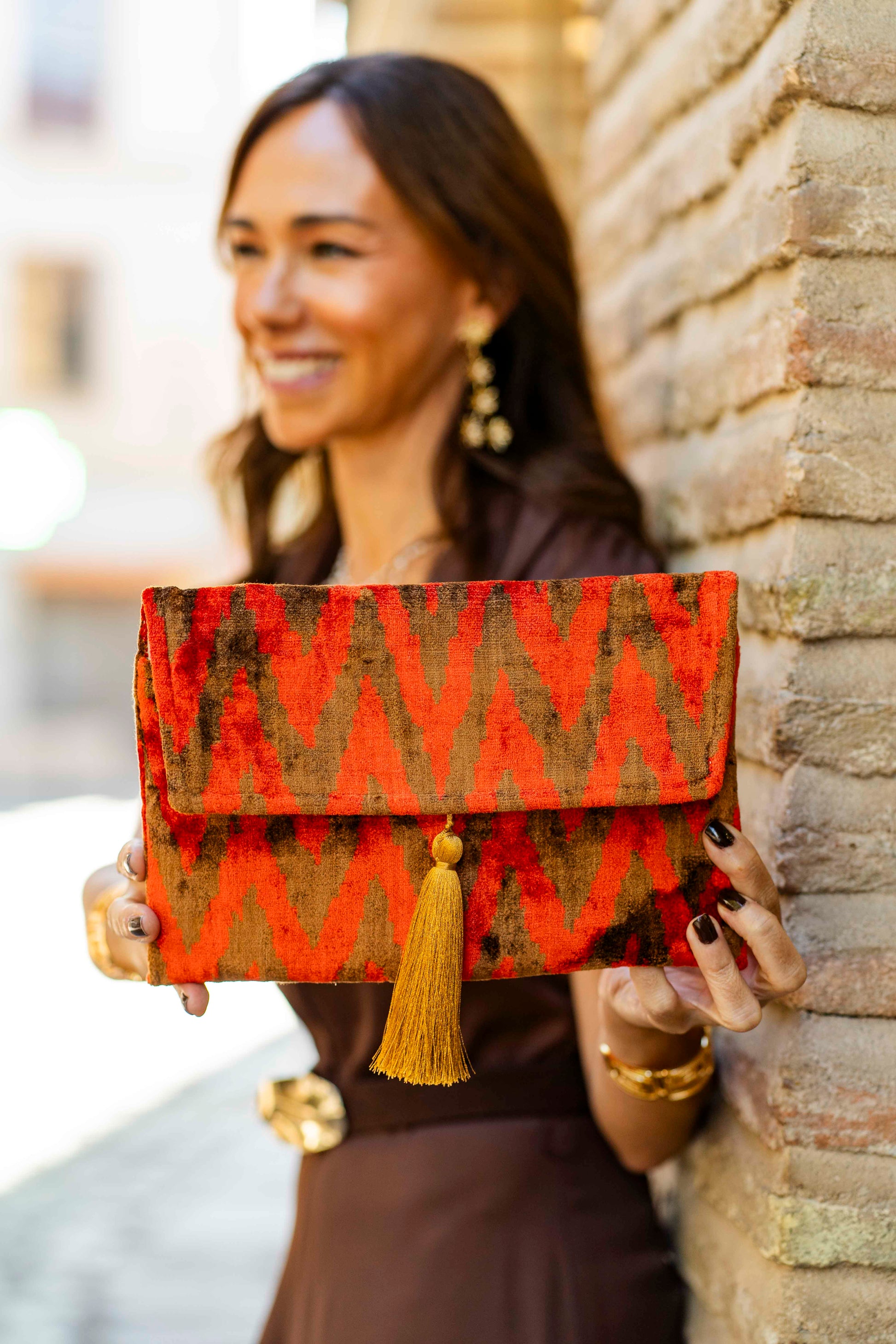 Cartera de mano ideal de Ikat, técnica de teñido el tejido con patrones, similar al tie-dye, confeccionada en terciopelo de seda. Colorido único y muy especial. te acompaña en tu look de perfecta invitada. Dimensiones 27 x18 cm. Borla de flecos de hilo de seda a juego o en contraste. Dispone de anclajes internos para cadena ( cadena incluida)