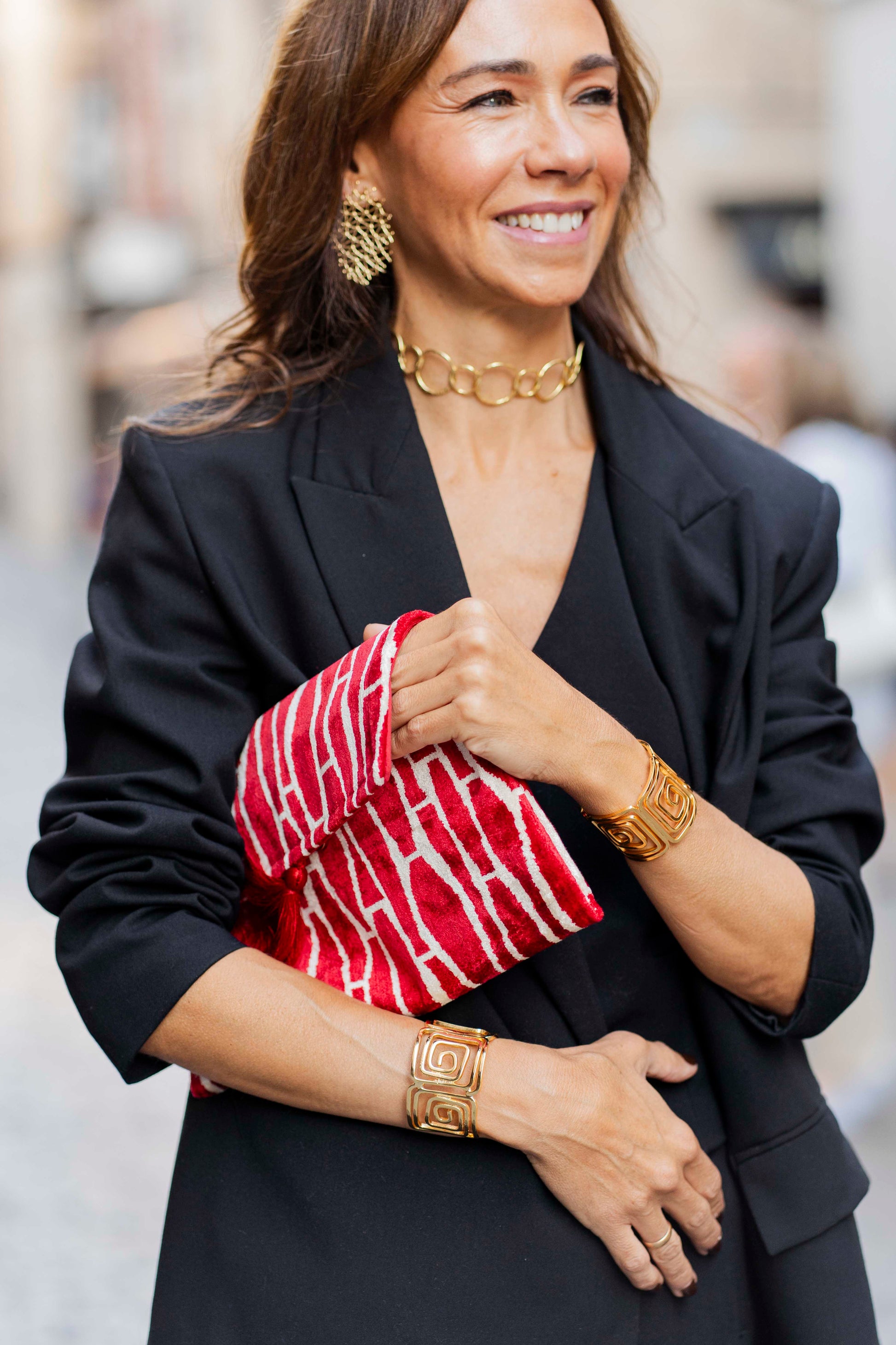 Cartera de mano ideal de Ikat, técnica de teñido el tejido con patrones, similar al tie-dye, confeccionada en terciopelo de seda. Colorido único y muy especial. te acompaña en tu look de perfecta invitada. Dimensiones 27 x18 cm. Borla de flecos de hilo de seda a juego o en contraste. Dispone de anclajes internos para cadena ( cadena incluida)