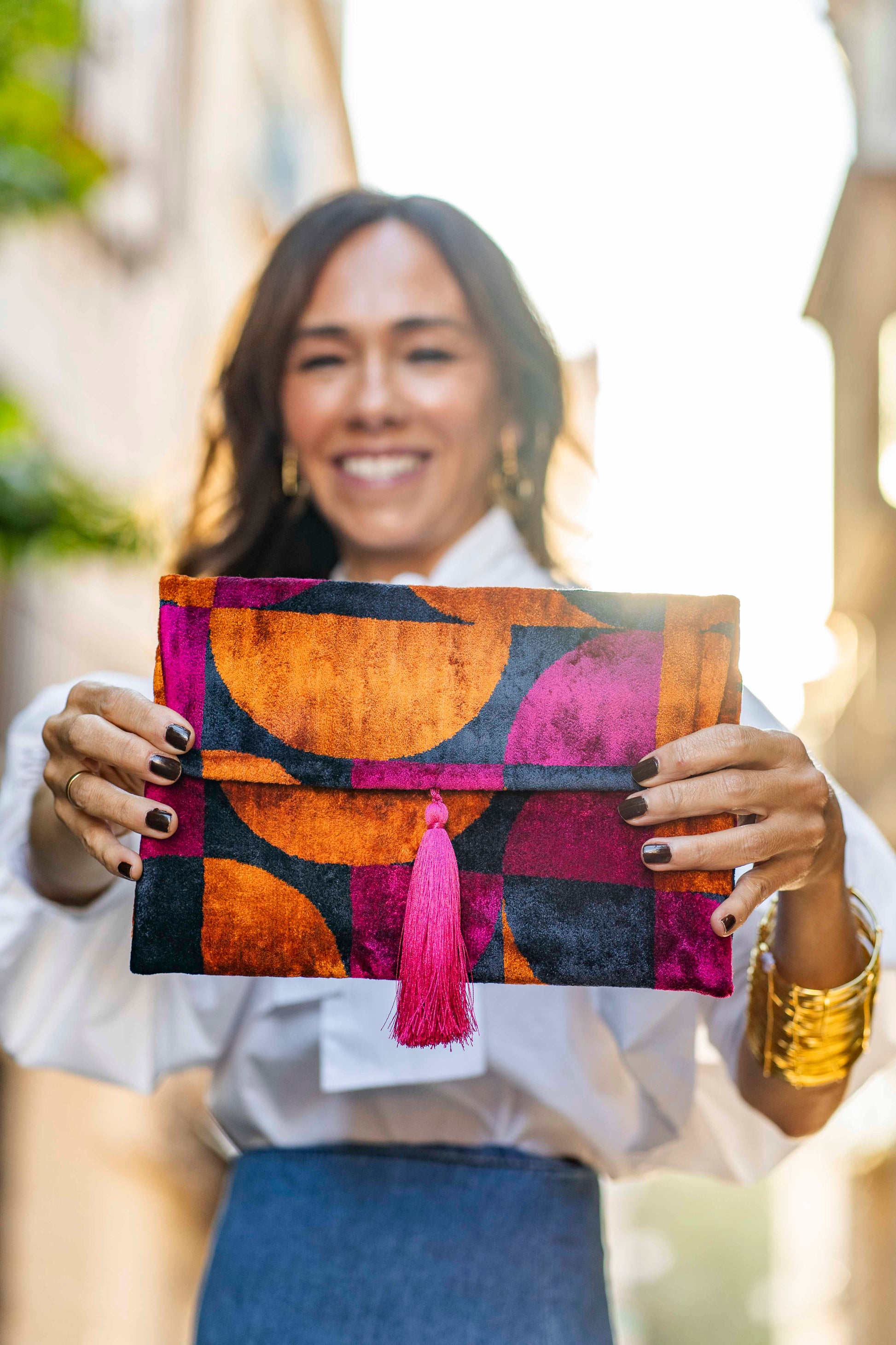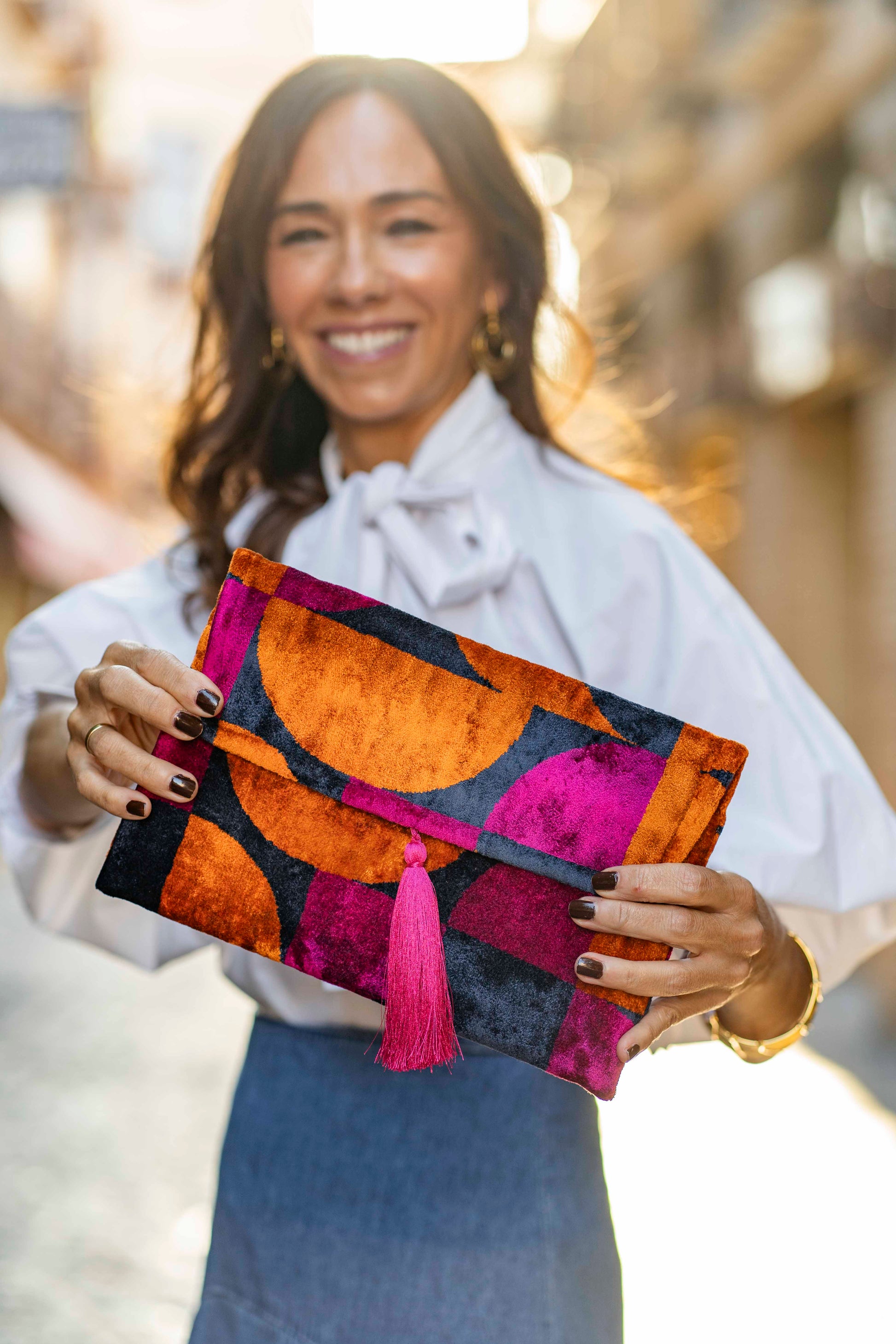 Cartera de mano ideal de Ikat, técnica de teñido el tejido con patrones, similar al tie-dye, confeccionada en terciopelo de seda. Colorido único y muy especial. te acompaña en tu look de perfecta invitada. Dimensiones 27 x18 cm. Borla de flecos de hilo de seda a juego o en contraste. Dispone de anclajes internos para cadena ( cadena incluida)