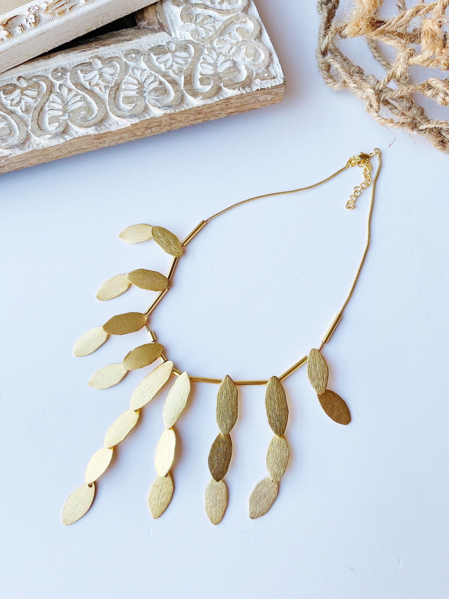Collar gargantilla de latón chapado en oro y con piezas haciendo forma de babero. Longitud 38 cm y adaptable con cadena de 5 cm para diferentes largos. Anchura del babero 7 cm. El complemento que necesitas para tu próximo look de invitada ideal o para ser la mas estilosa de tu oficina. Elegante y muy especial. Muy ligero. Cuidados de los complementos de latón: deja secar tu perfume antes de ponerte los collares. Es conveniente no mojarlos, debido al cloro del agua que puede afectar a estos metales .Invitadas elegantes. Eventos únicos.