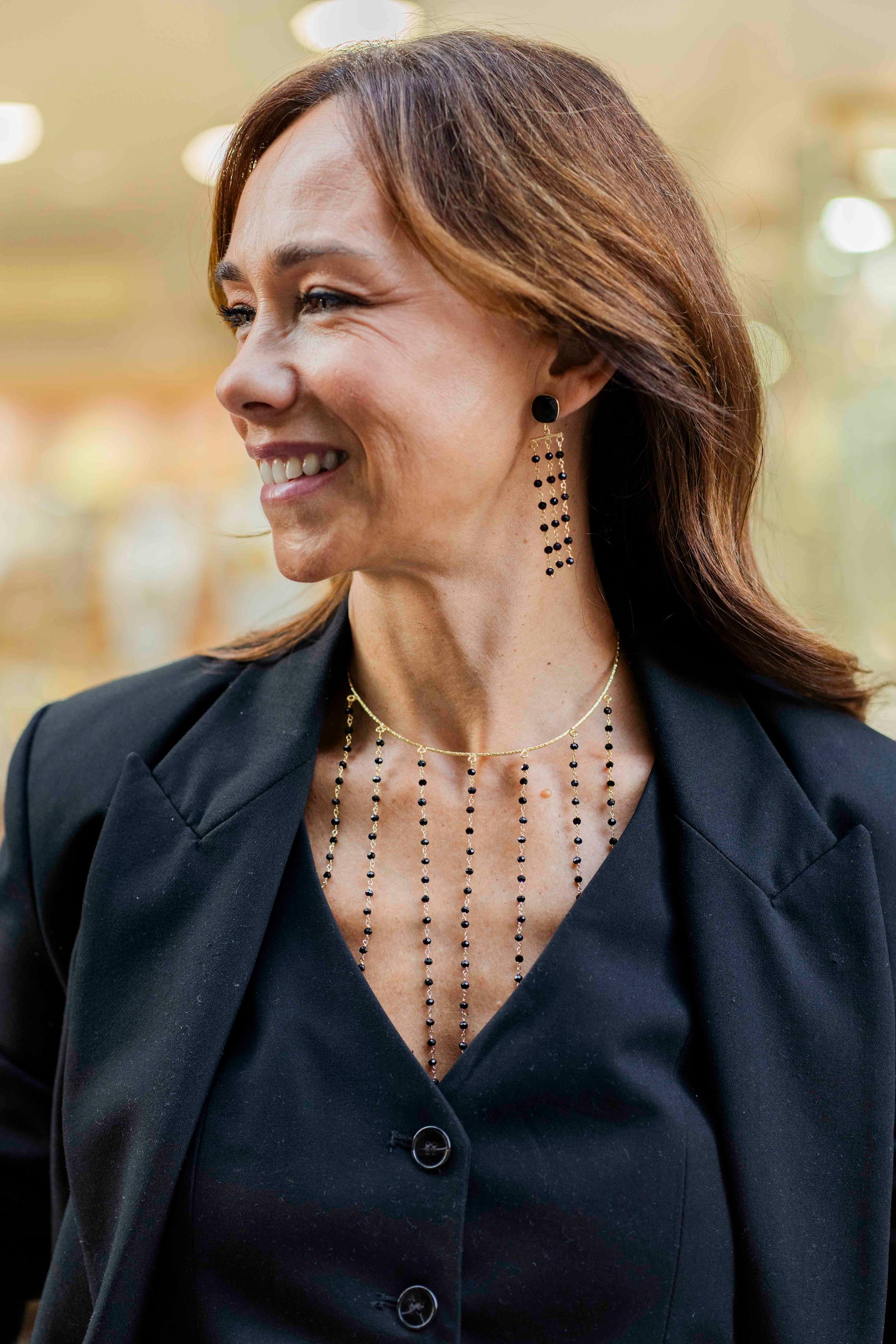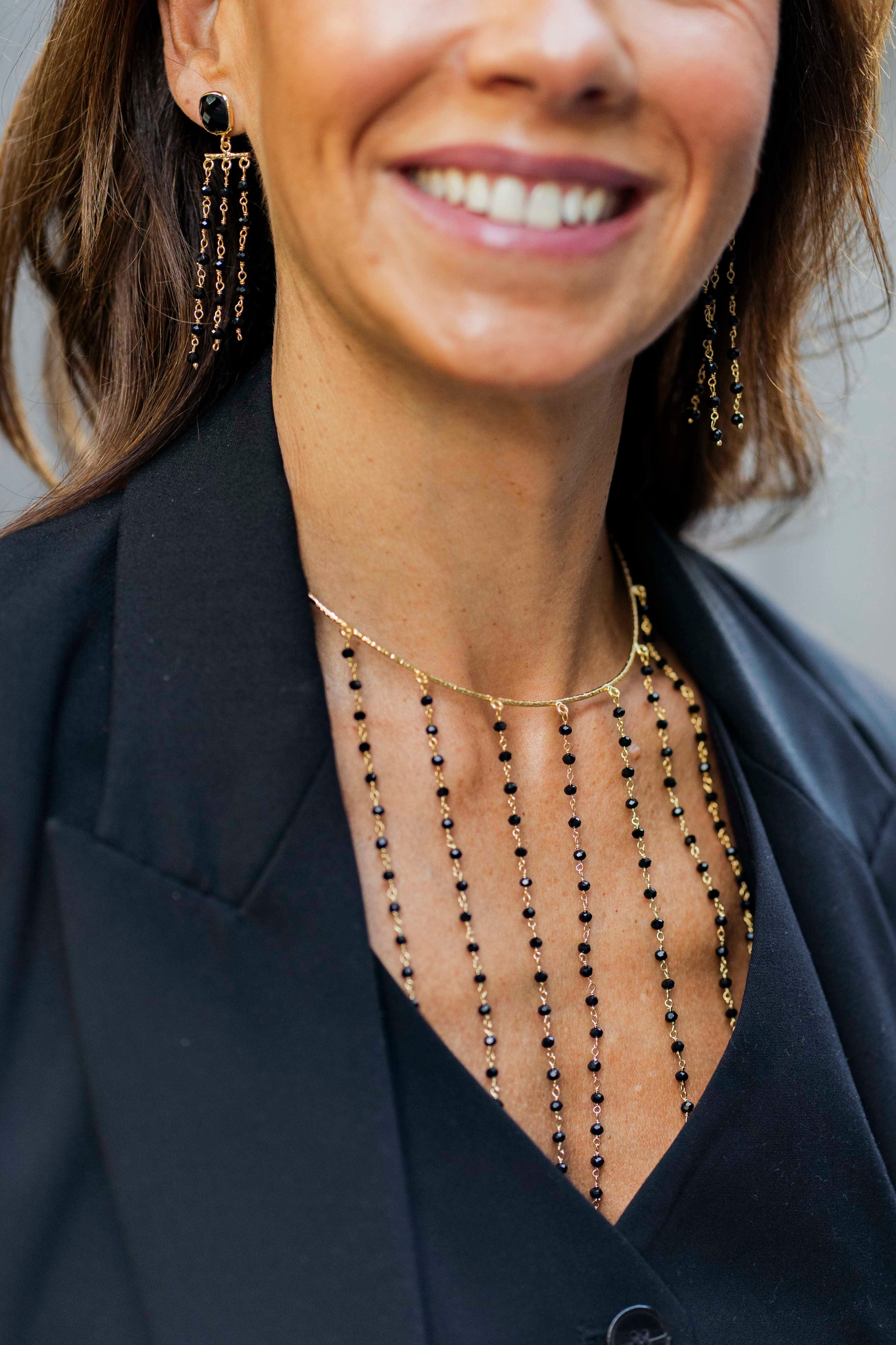 Choker rígido de latón chapado en oro y con cadenas de diferentes tamaños adornados con bolitas de ónix y pendientes a juego. Longitud del collar 16 cm y de los pendientes 7 cm. El collar es adaptable con cadena de 5 cm para diferentes largos. El complemento que necesitas para tu próximo look de invitada ideal o para ser la mas estilosa de tu oficina. Elegante y muy especial. Muy ligero.
