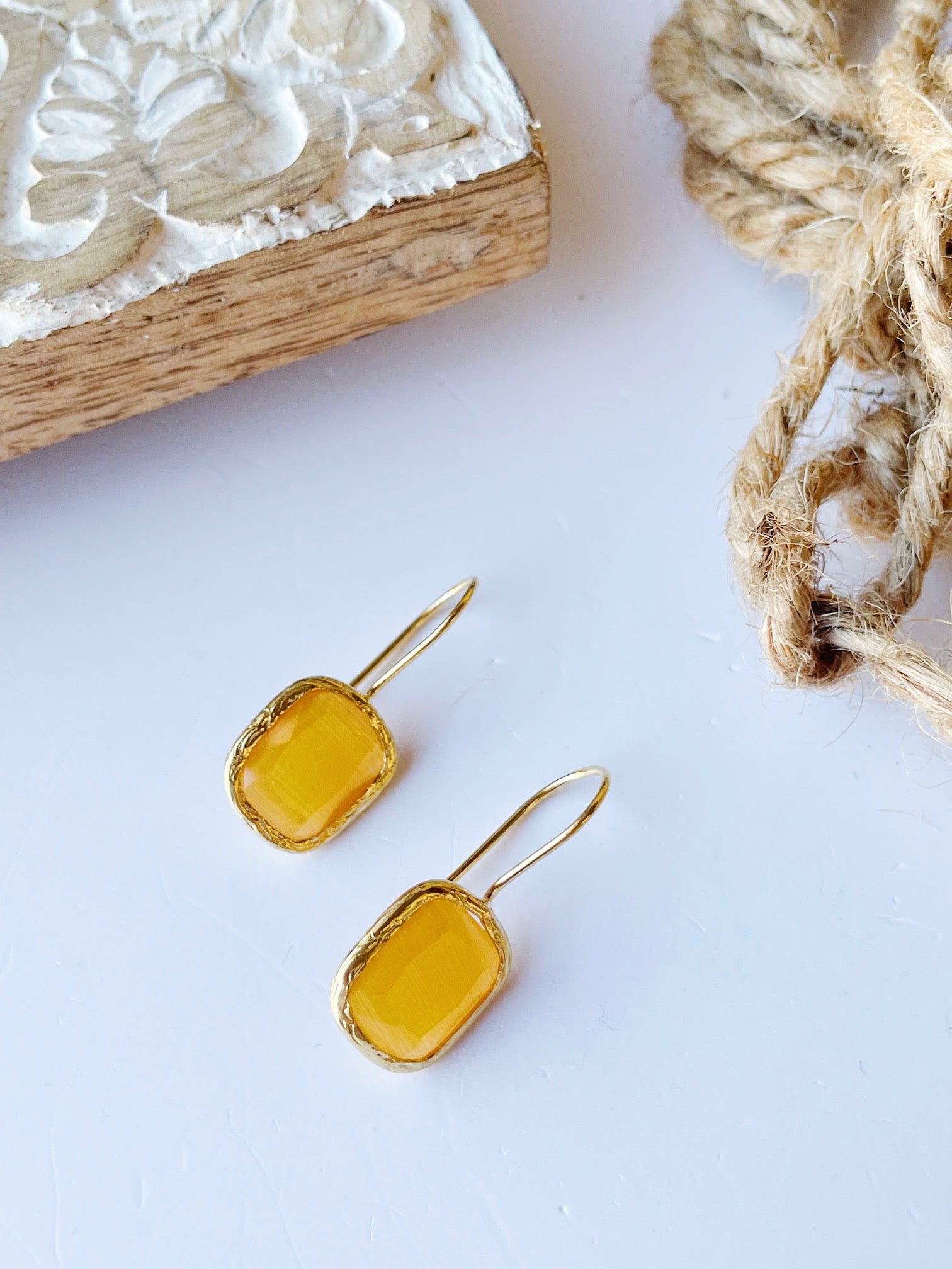 Pendientes de filigrana de latón chapado en oro con un ópalo de forma rectangular. Pendientes de bonitos colores. Piedras naturales. Longitud 3cm. Cierre de ballestilla. Para las que necesitan pendientes cortos y estilosos. Pendientes muy ligeros. Las piezas de la Colección Invitada están realizadas a mano, y son diferentes y únicas .